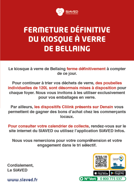 Le SIAVED informe les habitants de Bellaing que le kiosque à verre est définitivement fermé à compter de ce jour.