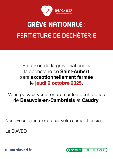 En raison de la grève nationale, la déchèterie de Saint-Aubert sera fermée le jeudi 2 octobre.