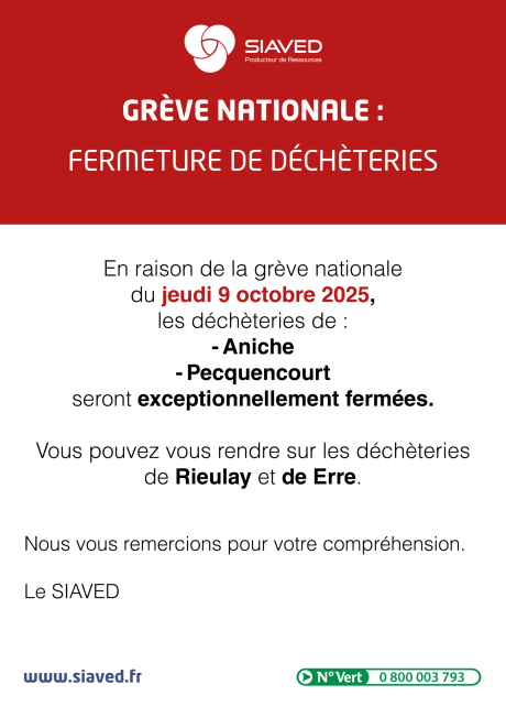 En raison de la grève nationale du jeudi 9 octobre, les déchèteries suivantes seront fermées :